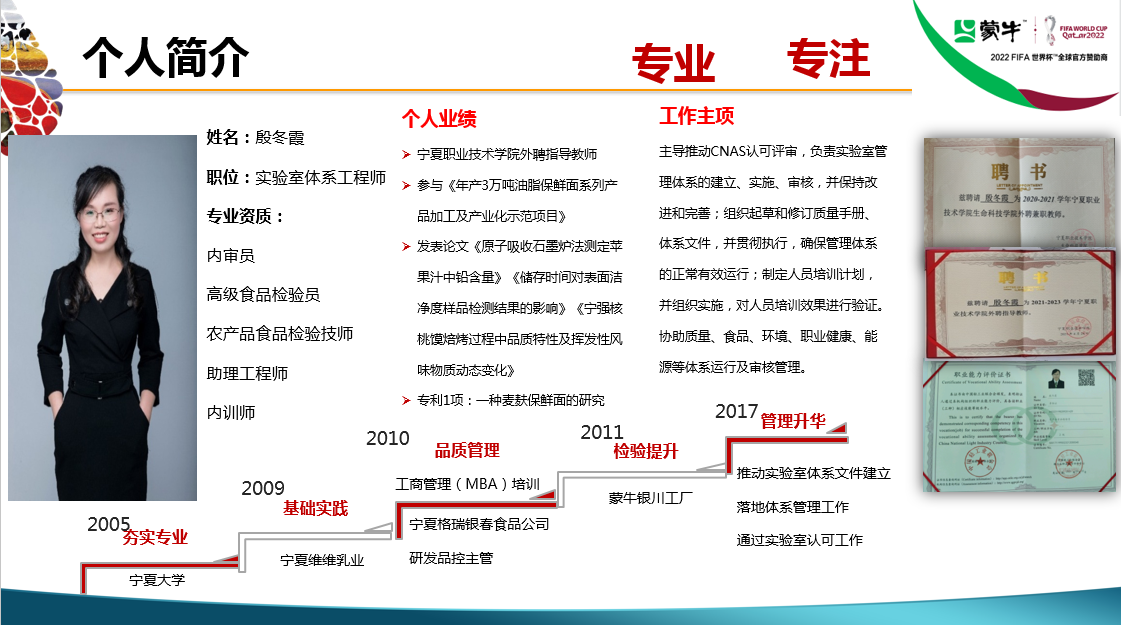殷冬霞老师是蒙牛特仑苏(银川)乳业有限公司的实验室体系工程师,具有内审员、高级食品检验员、农产品食品检验技师、内训师等职业资格证书,有着丰富的企业质量管理、内审和员工培训经验,也是我们香港三级片 食品科学与工程专业的优秀校友。