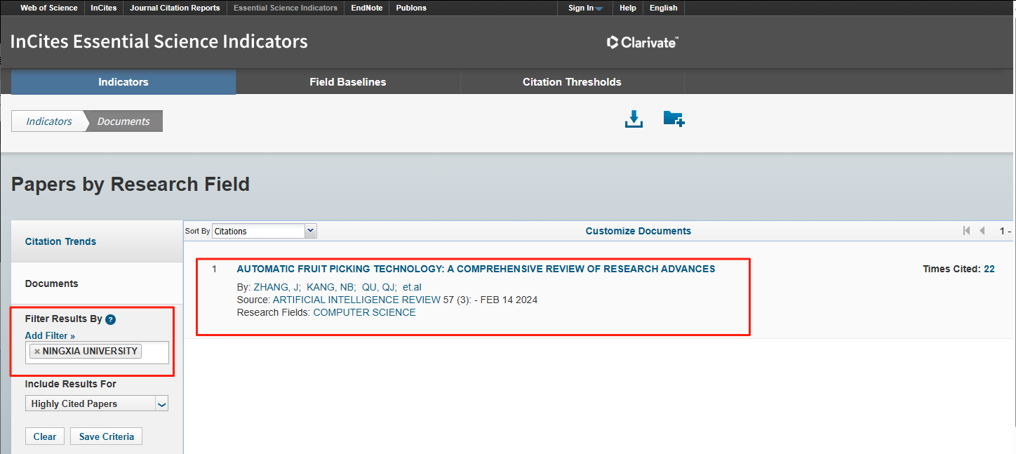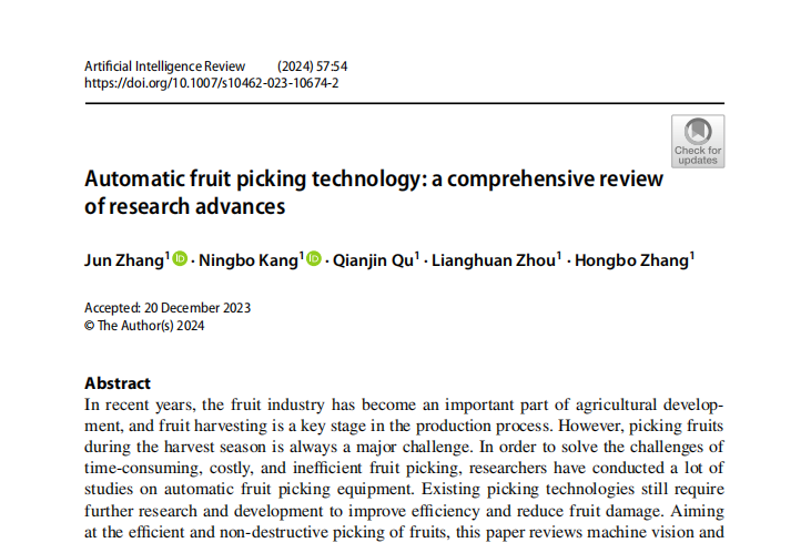 的论文“Automatic fruit picking technology: acomprehensive reviewofresearch advances”被遴选为ESI数据库高被引论文,其被引频次已进入计算机科学领域最优秀的1%之列。