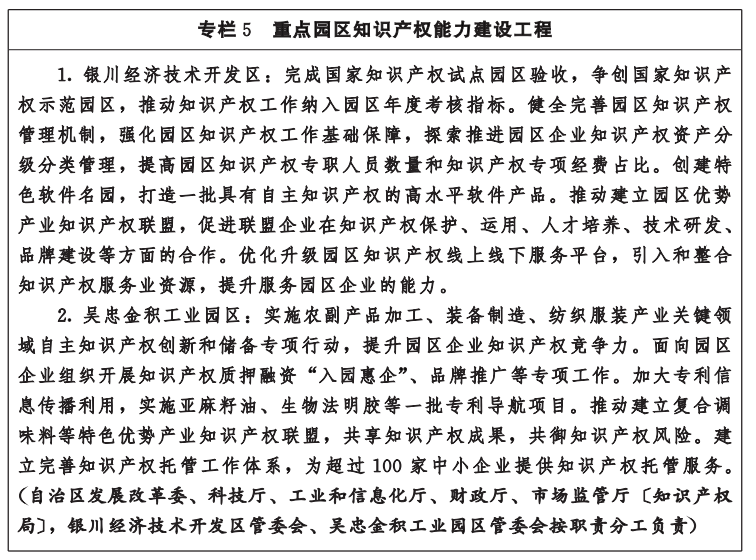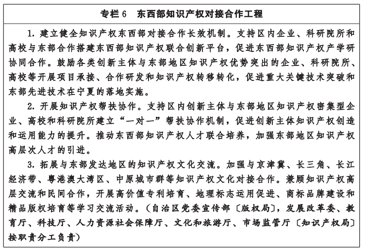 1.完善知识产权法规政策。依法及时推动知识产权地方性法规、规章的立改废释。探索制定电子商务、大数据和人工智能等新领域、新业态的知识产权保护规则,加强数据生产、流通、利用、共享过程中的知识产权保护。制定实施现代煤化工、新能源、新型材料、装备制造等优势特色产业的专利、商标、商号的保护政策,建立健全民间文学艺术作品、非物质文化遗产和中医药等领域的知识产权保护措施。研究制定规制知识产权滥用行为的有关工作规范。落实商业秘密保护规定。支持吴忠、固原出台地理标志保护和运用制度。依法加强涉及国家安全的知识产权对外转让行为管理。(自治区党委宣传部〔版权局〕、网信办,发展改革委、司法厅、生态环境厅、农业农村厅、商务厅、文化和旅游厅、卫生健康委、市场监管厅〔知识产权局〕,高级人民法院、人民检察院,银川海关,林草局、药监局按职责分工负责)
