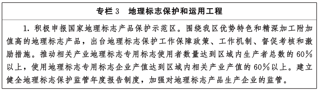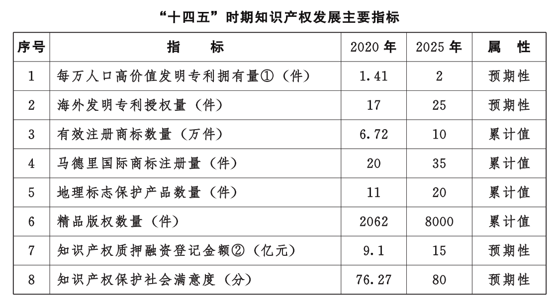 ———知识产权创造量质齐升。在九个重点产业中培育一批高价值发明专利,每万人口高价值发明专利拥有量达到2件,专利合作条约PCT专利申请量年均增长率达到10%。有效注册商标总量达到10万件。地理标志保护产品、地理标志商标和农产品地理标志数量累计分别达到20件、40件和100件。软件和其他版权作品登记量年均增长率达到20%,精品版权数量达到8000件。
