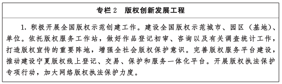 2.加强知识产权公共服务信息化建设。建设自治区知识产权公共信息服务平台,提供专利、商标、版权等知识产权便利化检索服务。支持有条件的地市设立综合性知识产权信息公共服务机构,鼓励市场化知识产权信息服务机构向社会免费或者低成本开放有关服务产品。搭建宁夏线上版权作品登记平台,优化版权登记程序。深化银川经济技术开发区知识产权服务平台建设,丰富平台功能。结合地方产业特色,建设专业化知识产权专题数据库。强化人工智能、区块链技术在知识产权公共服务中的应用。建立知识产权信息安全风险评估机制,增强网络安全综合保障能力。(自治区党委宣传部〔版权局〕、网信办,发展改革委、科技厅、工业和信息化厅、财政厅、市场监管厅〔知识产权局〕,银川经济技术开发区管委会按职责分工负责)