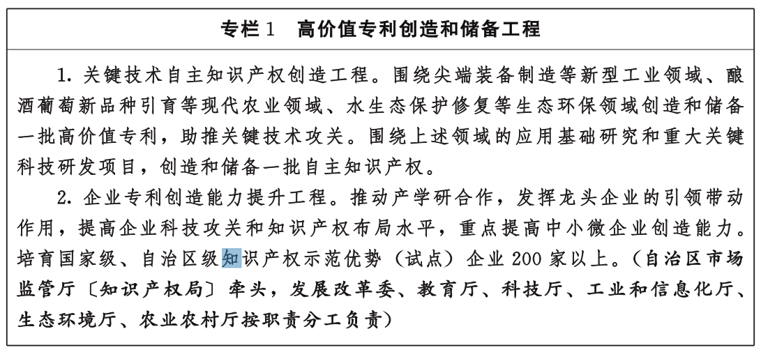 1.健全高质量创造的激励政策。健全完善知识产权创造激励政策,加大对后续转化运用、行政保护和公共服务的支持。建立重大、关键技术知识产权攻关目录,推进科技规划与知识产权事务协同。在高校院所等科研机构建立专利申请前评估制度,切实提升专利申请质量,将高价值专利产出作为科技计划项目立项、绩效考核的重要指标。探索建立知识产权考核激励机制,推动知识产权工作纳入自治区属国有企业、国有控股企业绩效考核评价体系。强化评优选拔、资格认定、职称评定中知识产权评价质量导向,探索设立自治区级专利奖项,促进形成崇尚创新、追求卓越的良好社会氛围。(自治区党委宣传部〔版权局〕,发展改革委、教育厅、科技厅、工业和信息化厅、人力资源社会保障厅、农业农村厅、市场监管厅〔知识产权局〕、国资委,林草局按职责分工负责)