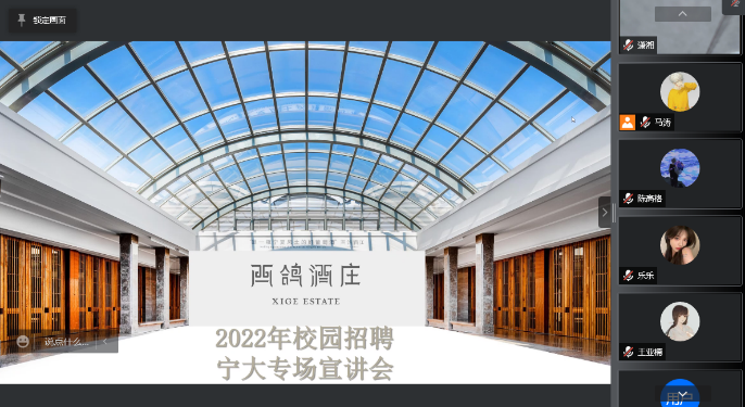 为了更好的拓宽毕业生就业渠道,2022年4月1日下午14:00,西鸽酒庄举办了线上招聘会议。通过PPT展示讲解的方式,HR向同学们介绍了公司的香港三级片、现有产业结构、组织构架、福利待遇。西鸽酒庄成立于2017年,酒庄总建筑面积约2.5万平米,包含葡萄酒酿造区、橡木桶酒窖、灌装区、瓶装陈酿酒窖、专业品鉴区、游客接待中心、庄园酒店和有机特色餐厅,年设计产能1000万瓶,是宁夏综合设施相对完整、建筑标准超卓的酒庄。作为酒庄长期发展规划的一部分,西鸽种植团队仍在不断挑选优异条件的地块,预计22年将新开超过1万亩新地。此外,西鸽也持续投入品种及技术创新,不断挖掘宁夏风土的潜力与未来。此外我们也与法国波尔多学院,国内业内顶尖高校携手教研实践项目,为创新技术时间及人才培养提供平台。