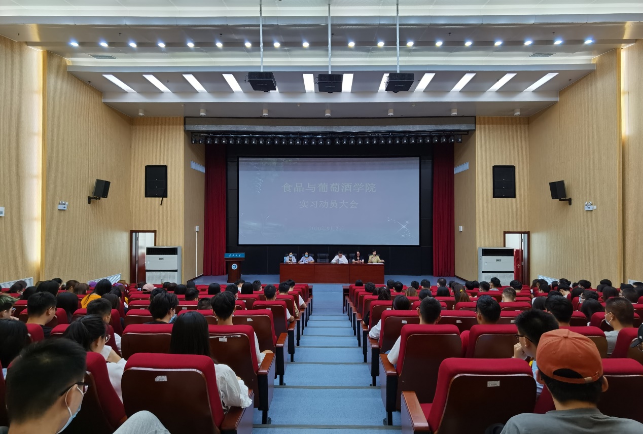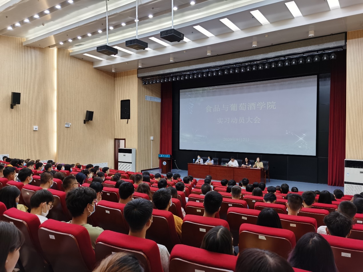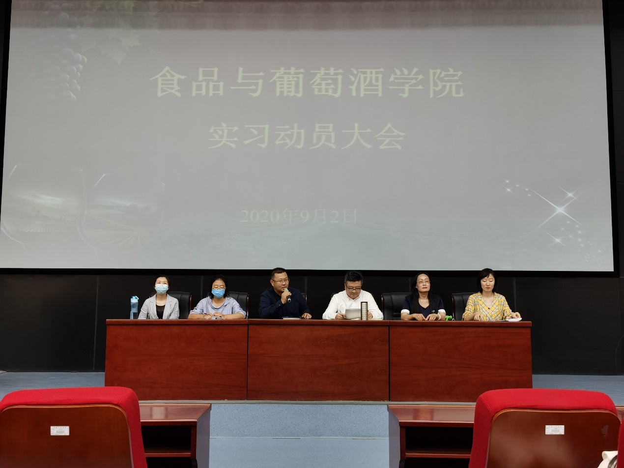 在科技楼一楼多功能报告厅组织开展实习动员大会,学院党总支副书记马浩谦老师、副院长方海田老师、葡萄与葡萄酒工程教研室主任孙悦老师、葡萄酒营销教研室主任李茹一老师、葡萄酒文化旅游教研室主任毛凤玲老师、教学科研办公室薛婷婷老师以及2017、2018级全体同学参加了动员会。