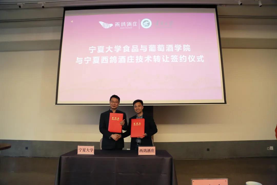 宁夏葡萄与葡萄酒研究院副院长张军翔与西鸽酒庄副总经理廖祖宋签订技术转让合同。
