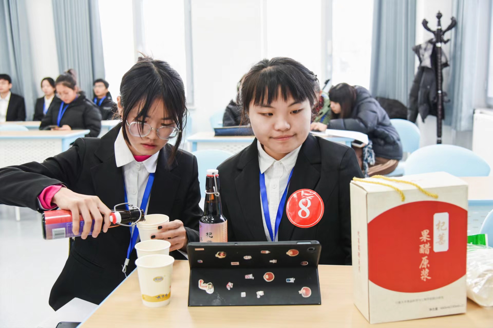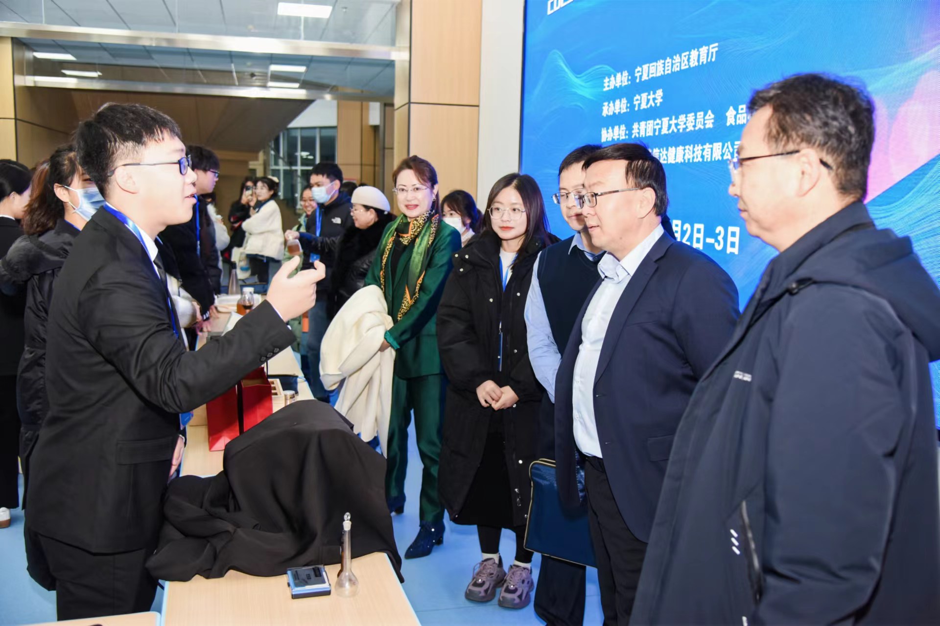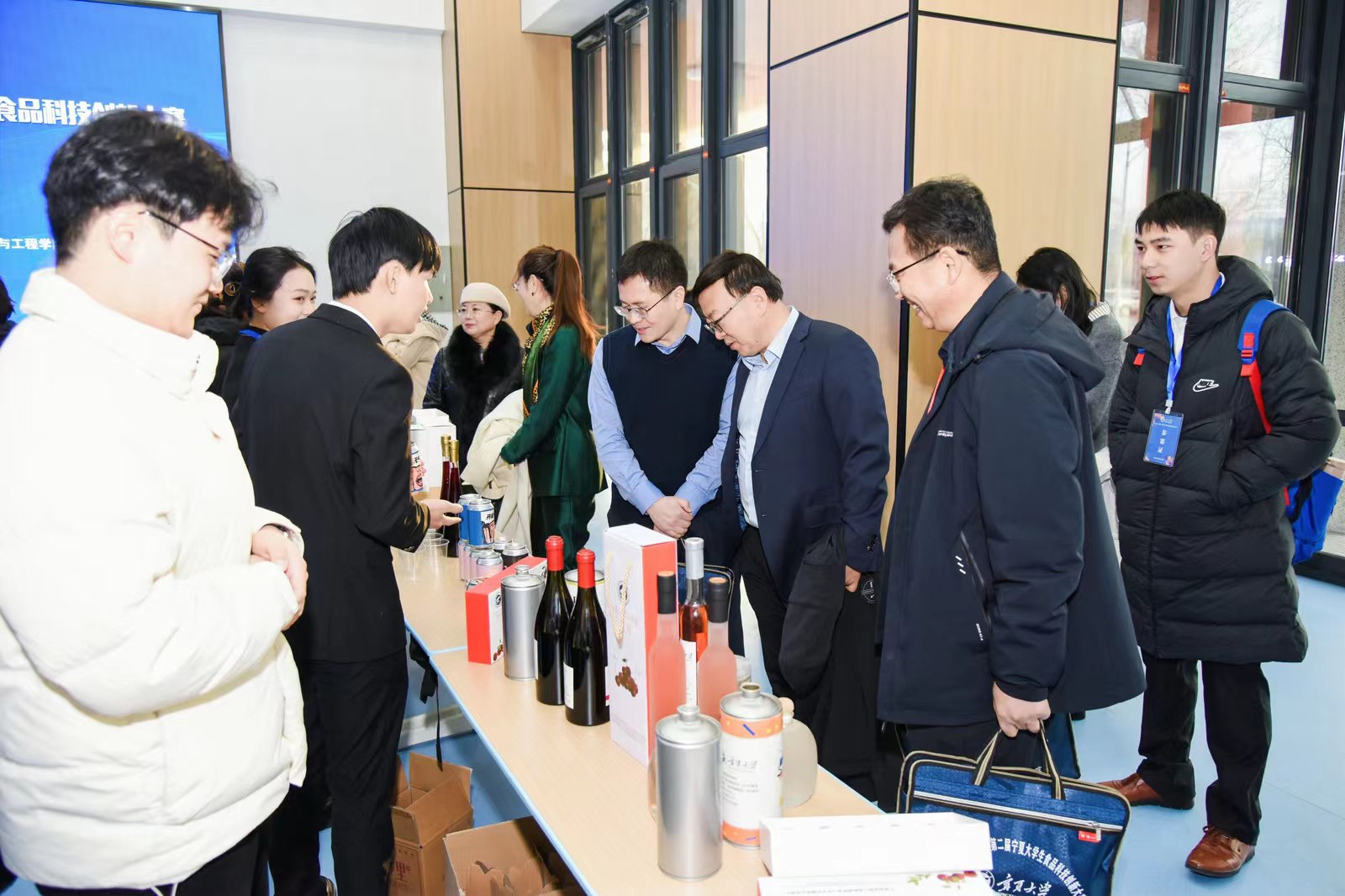 贺兰山校区未来教室一楼大厅展示创新成果,包括食品创新作品、食品安全检测技术、新型食品包装等。