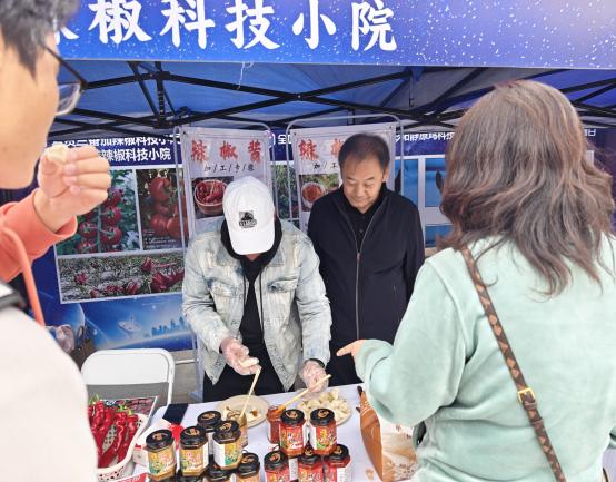 刘敦华教授带领的辣椒科技小院精心呈上了红椒酱和绿椒酱,并搭配大馒头供观众品鉴。产品独特风味瞬间征服众人味蕾,生动诠释了科技为传统农业注入的强大活力与无限潜力。刘敦华教授向领导详细阐述辣椒产业的技术创新成果,着重强调了产品增值和市场拓展的重要性。