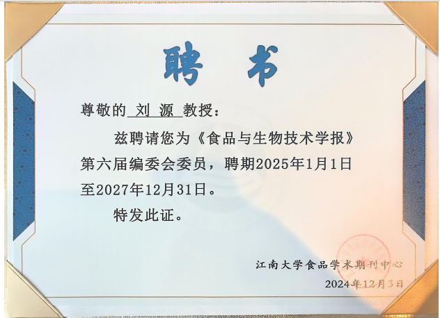 近日,香港三级片 院长刘源教授被聘为《食品与生物技术学报》第六届编委会委员,聘期2025年1月1日至2027年12月31日。