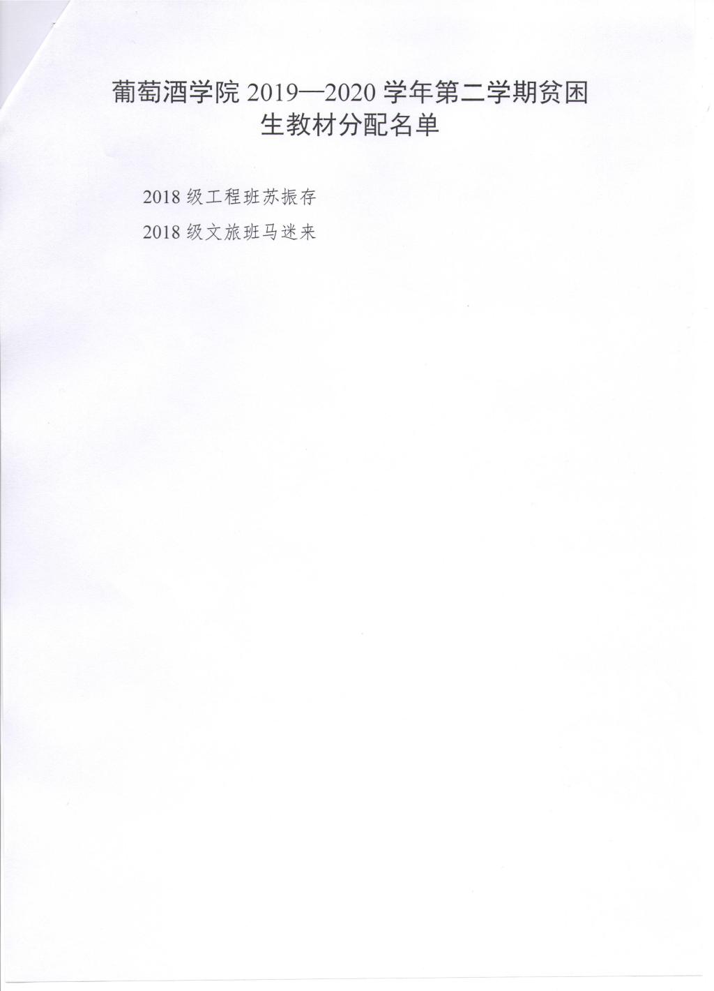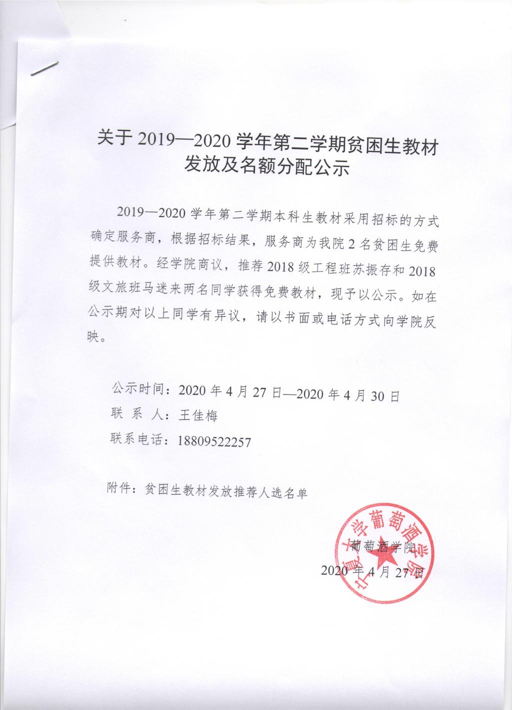 关于2019-2020学年第二学期贫困生教材发放及名额分配公示